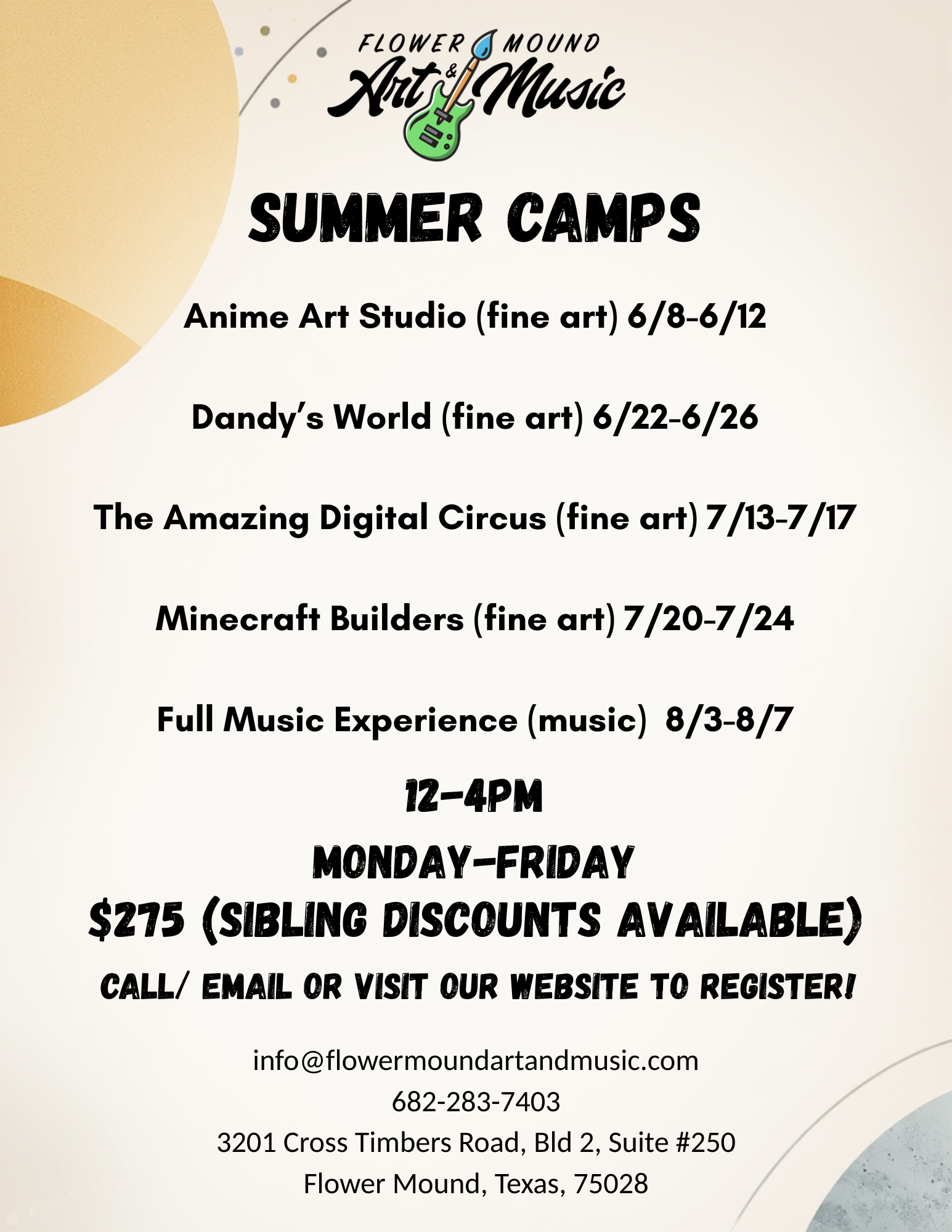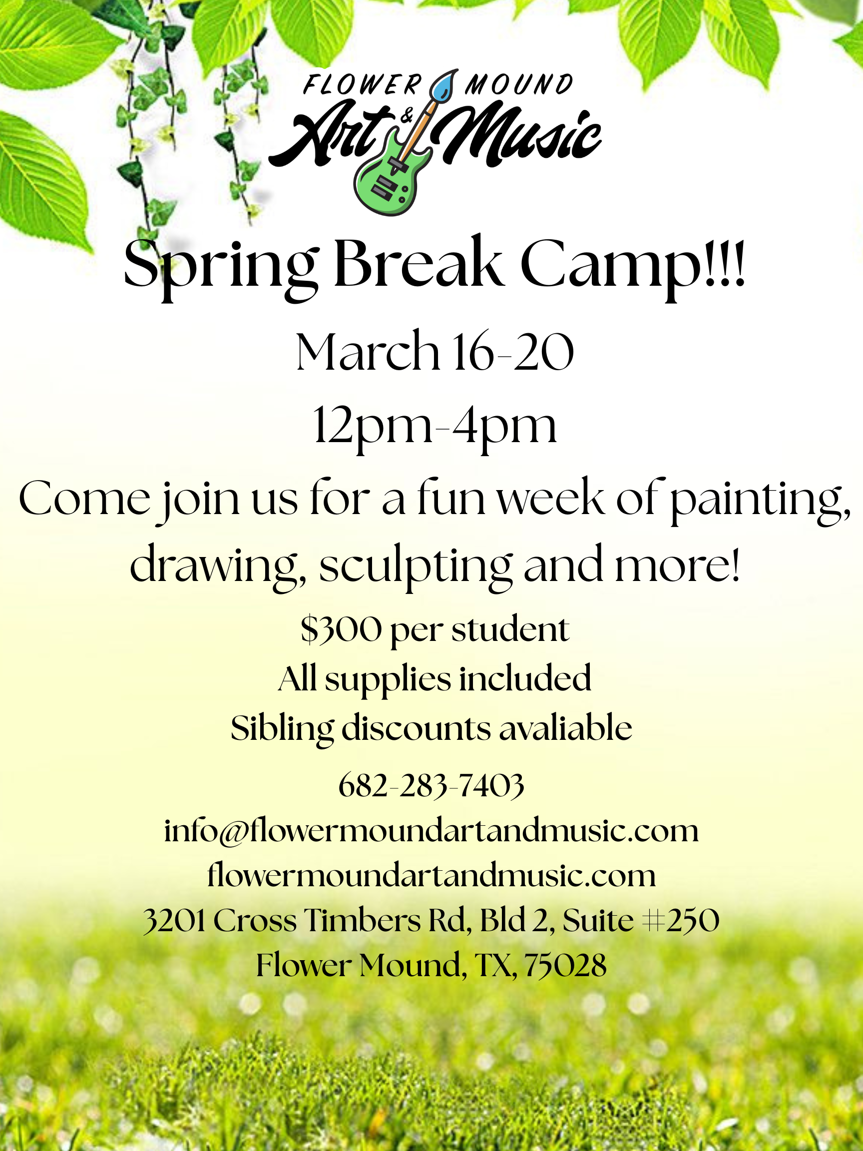 Flower Mound Art & Music offers fall camp, drawing lessons, music lessons, painting lessons, afterschool art classes, children's classes, adult classes, paint and sip, and more! Our programs are designed to help you explore your creative side. From painting to theater to music, you'll find classes to suit your interests and abilities.